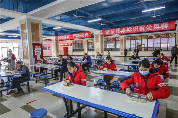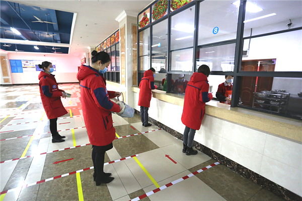 在打飯窗口前,根據(jù)地面張貼標(biāo)識,有序在打飯窗口前排隊,前后相鄰兩人間隔1米以上。