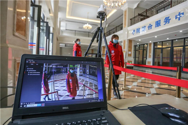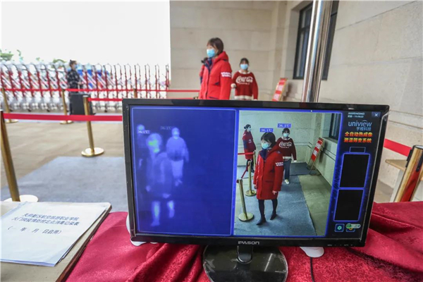 師生在進入教學(xué)大樓前,需佩戴好口罩,有序在“測溫專用通道”前排隊,前后相鄰兩人間隔1米以上,進入“紅外線體溫檢測區(qū)”,對師生進行體溫檢測,確保師生檢測體溫正常。