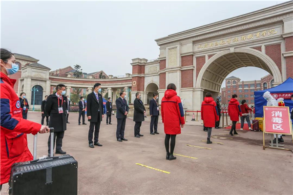 檢測體溫正常的返校學(xué)生迅速通過“紅外線體溫檢測區(qū)”,從學(xué)院正大門右側(cè)進入學(xué)院內(nèi)。