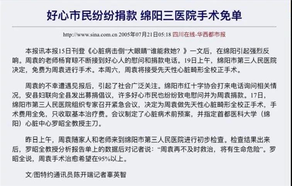 2005年7月15日,一篇名為《心臟病擊倒“大眼睛”,誰能救她?》的新聞在《華西報市報》“巴蜀新聞”版面刊發(fā)。這則新聞報道了“綿陽安縣小學(xué)四年級學(xué)生周袁,被查出患有先天性心臟病,父母身患重病,被病痛折磨的家庭生活極為困難,負(fù)債累累,高昂的心臟病手術(shù)費用即將成為壓垮他們一家的最后一根稻草”,記者呼吁社會愛心人士伸出手,獻(xiàn)愛心,挽救這個可愛的小女孩的生命。