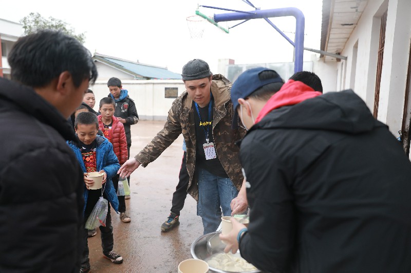 村小的小朋友很少有機(jī)會(huì)吃上蛋糕、餃子。當(dāng)天,志愿者們天剛微亮就去菜市場(chǎng)進(jìn)行了一番大采購(gòu),為了中午給孩子們親手包一頓餃子。很多人第一次學(xué)著搟面皮、捏褶、第一次在露天的操場(chǎng)包餃子、第一次燒柴火……雖然包出來(lái)的2000個(gè)餃子形態(tài)各異,雖然一直彎著的腰有點(diǎn)酸痛,但是志愿者們看到孩子們吃著餃子的那種開(kāi)心,顯得十分滿(mǎn)足。