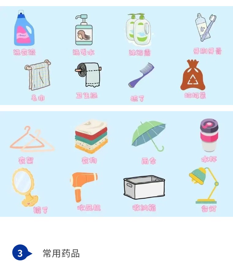 鏡子、梳子、指甲鉗、衛(wèi)生紙、水杯、衣架、粘鉤、雨傘、小鎖頭、針線盒、毛巾、洗衣液、肥皂、插排、吹風(fēng)機(jī)(特別提醒:功率一定要在800W以下?。。。┻€有一些洗漱化妝的用品也記得準(zhǔn)備上。