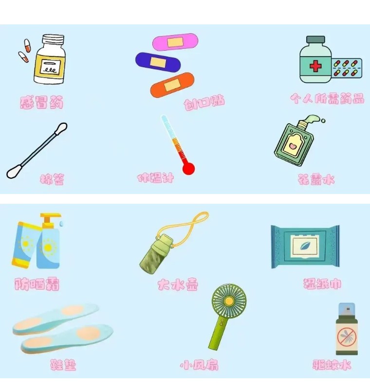 準(zhǔn)備好一些常見(jiàn)的醫(yī)藥品,比如感冒藥、退燒藥、防暑藥物、止瀉藥、碘酒、創(chuàng)口貼、醫(yī)用棉簽、跌打損傷藥等。