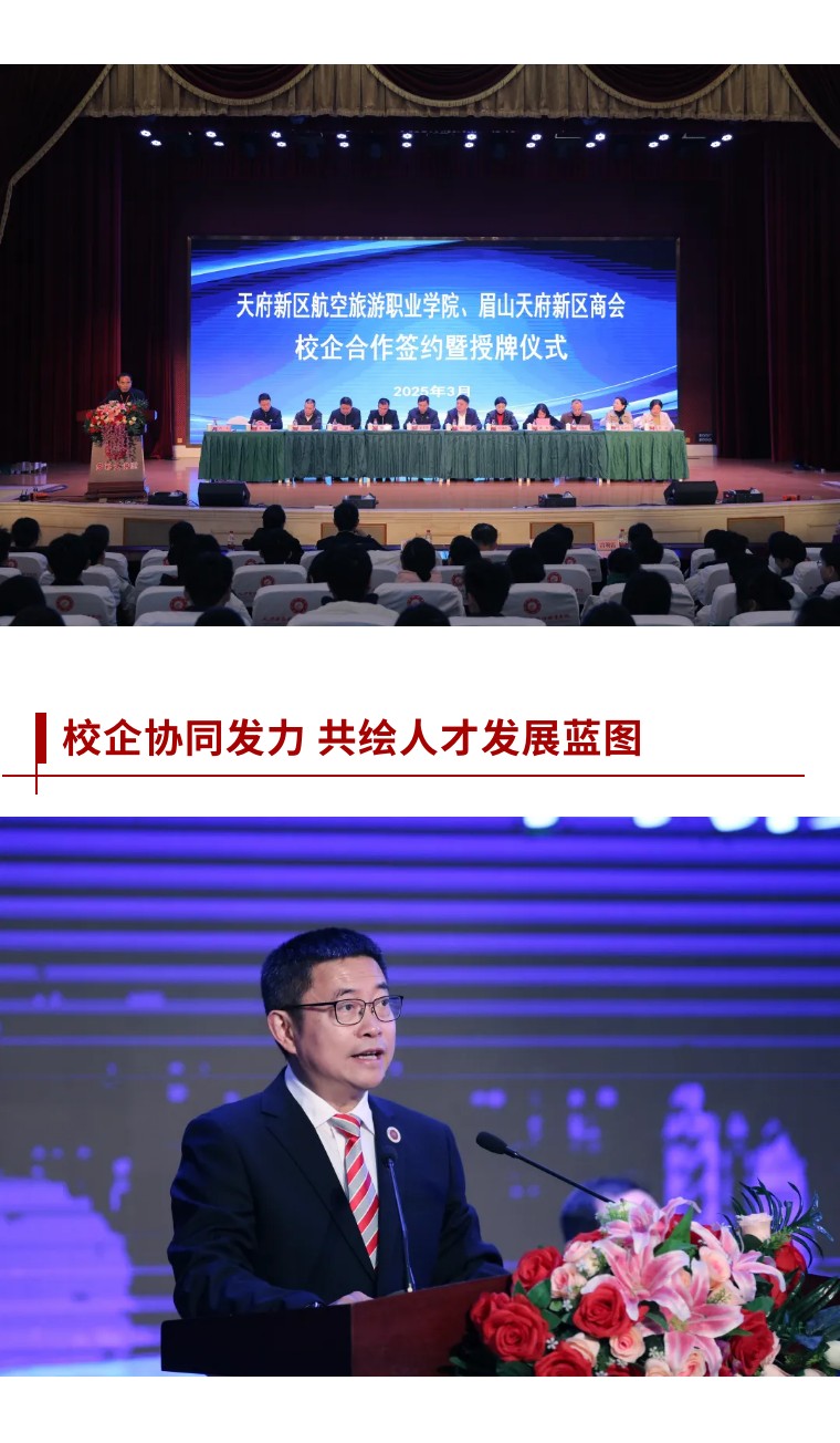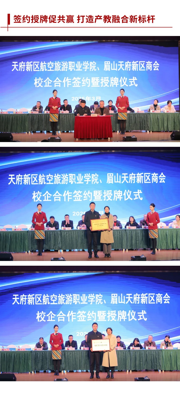 3月11日,天府新區(qū)航空旅游職業(yè)學院與眉山天府新區(qū)商會舉行校企合作簽約暨授牌儀式。眉山市人大常委會副主任、天府新區(qū)眉山黨工委常務副書記廖仁軍,眉山市委統(tǒng)戰(zhàn)部副部長、市工商聯(lián)黨組書記何建瓊,眉山天府新區(qū)一級調研員陳青松,眉山市工商聯(lián)黨組成員、副主席劉前線,天府新區(qū)眉山黨工委黨群工作部副部長潘燕,天府新區(qū)眉山黨工委黨群工作部副部長王冰,眉山天府新區(qū)商會會長范松如,四川新達粘膠科技有限公司總經(jīng)理郭明高,四川五洲仁信科技有限公司總經(jīng)理鄧永紅,四川厚天科技股份有限公司總經(jīng)理蔡敏,四川東星航空教育集團董事長、天府新區(qū)航空旅游職業(yè)學院總督學辜英智,天府新區(qū)航空旅游職業(yè)學院院長劉陽等學校相關領導及師生代表共同見證這一重要時刻。