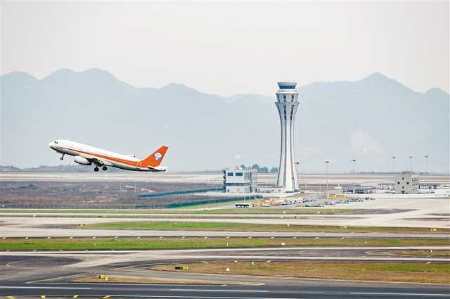 圖:2月19日,重慶機場T3塔臺,一架飛機從旁起飛。謝智強 攝