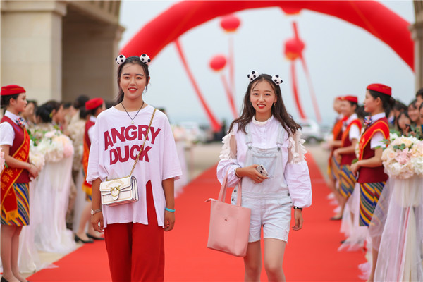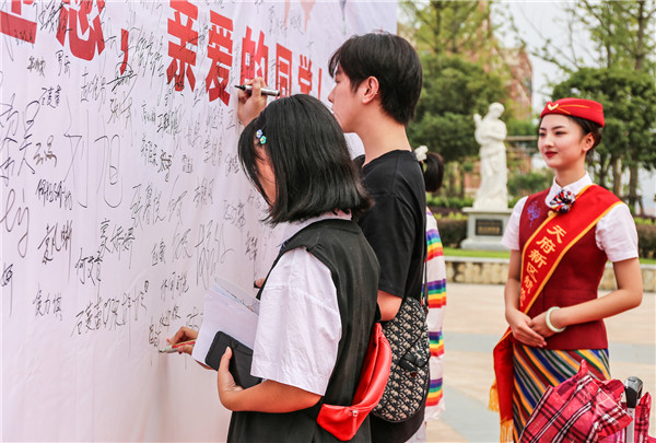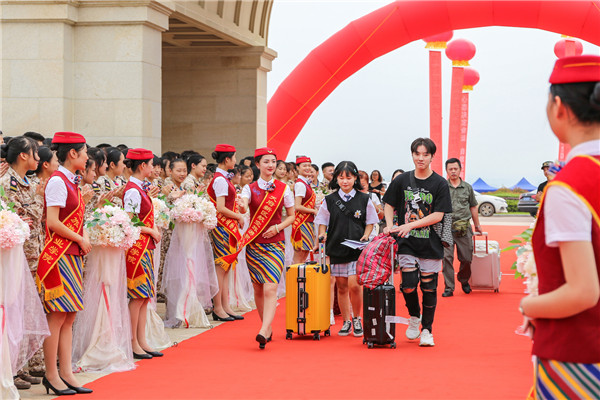 歡快的迎賓曲在學(xué)院上空縈繞,一條百余米長的紅色地毯,從校門外延伸至校內(nèi)的瑞麗廣場(chǎng),兩旁的粉紅色路引花臺(tái)和簽到墻正面的櫻花花門浪漫又拉風(fēng),粉紅色花門兩旁人頭攢動(dòng),由200多名學(xué)生組成的“親友團(tuán)”做好了歡迎同學(xué)的準(zhǔn)備……