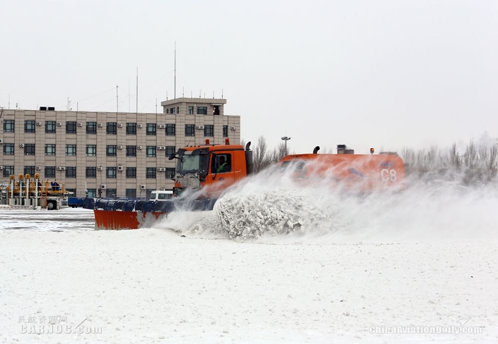 由于持續(xù)降雪,清雪隊(duì)員采取雪下即掃、邊下邊清、反復(fù)清理、及時(shí)拉運(yùn)的方式組織調(diào)配機(jī)械設(shè)備,并合理避開(kāi)航班高峰,利用航班間隙,集中20臺(tái)主力掃雪車同時(shí)對(duì)跑道、滑行道進(jìn)行清掃,確保機(jī)場(chǎng)的暢通。