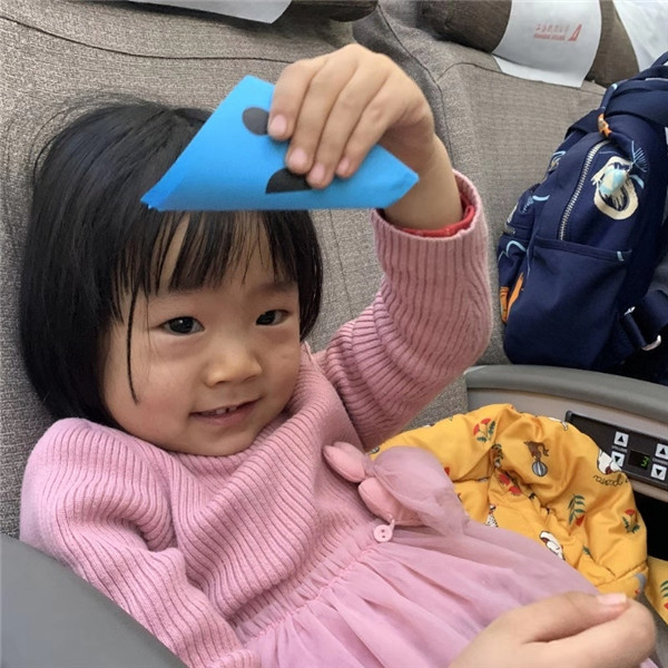 她,叫張向瑩,她叫自己“張?zhí)}卜”,上機(jī)的時(shí)候就發(fā)現(xiàn)她就格外的開心,在忙完工作的閑暇之余,乘務(wù)員拿了份折紙給張?zhí)}卜小朋友,古靈精怪的她折好了一張,她害羞的告訴我這是她折的“榴蓮披薩”。